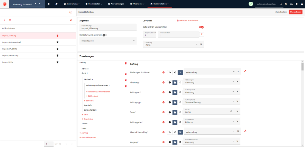 Beim dateibasierten Import muss eine Importdefinition erstellt und definiert werden. In der Oberfläche der Importdefinition ordnen Sie die Spalten/Felder aus den importierten Dateien den entsprechenden Feldern in adelo® zu. Dies ermöglicht es Ihnen, die Struktur und das Format der importierten Daten an die Anforderungen von adelo® anzupassen. Darüber hinaus können Sie in dieser Oberfläche einfach und schnell Importdefinitionen erstellen und erweitern, um den Import an verschiedene Dateien, Dienstleister und Auftraggeber anzupassen.